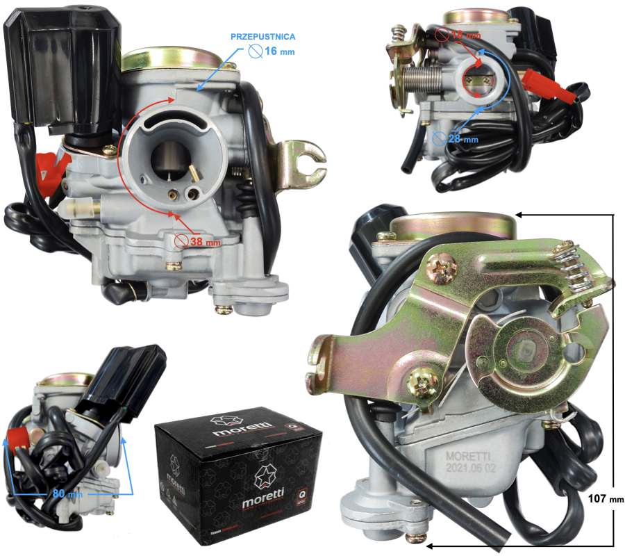 Gaźnik Moretti GY6, 50cc 4T, p.16 mm, ssanie automatyczne, metalowa pokrywa